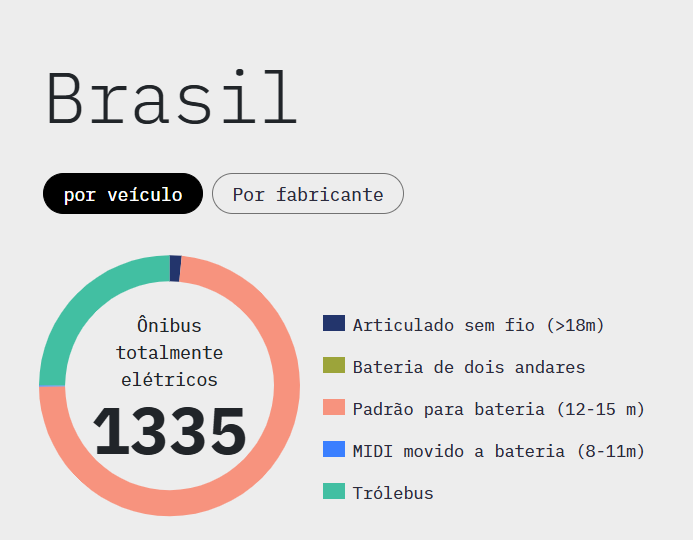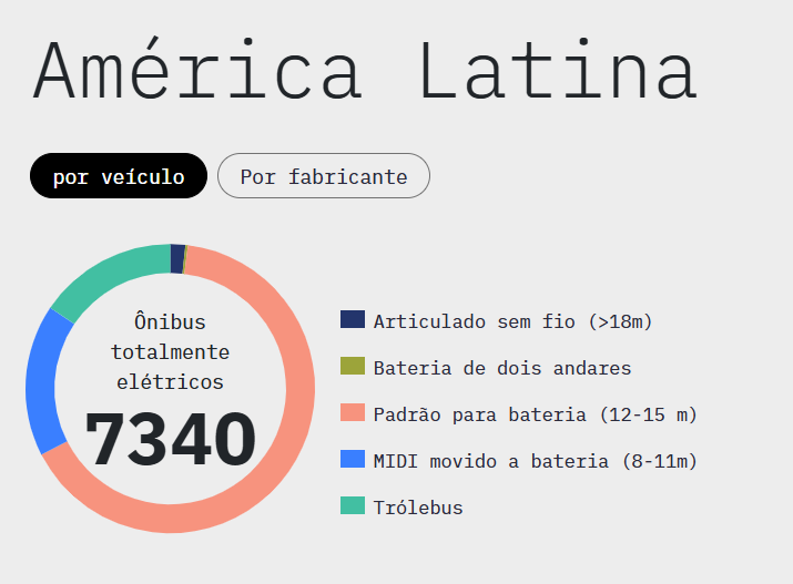 Segundo o E-Bus Radar, que monitora a frota de ônibus eletrificado na América Latina, já são 7.340 ônibus elétricos, a maioria padrão 100% a bateria; e no Brasil, já estão 1.335 unidades. Os dados foram atualizados até setembro de 2025.