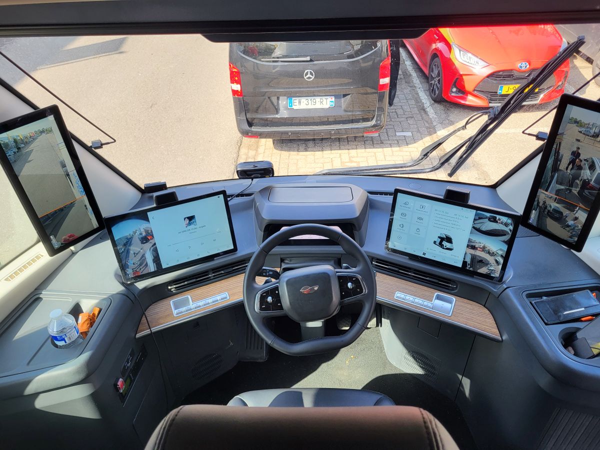 A cabine do Windrose EV é grande. Pegamos a fita métrica e medimos 2,80 metros metro de comprimento, 2,20 metros de largura e 2,45 metros de altura. A cama, com colchão fino, tem 88 cm de largura. Um segundo assento está agora opcionalmente instalado. Encostados à parede posterior, vemos três grandes armários. Sob o para-brisa inclinado, há um painel razoavelmente largo, com bastante espaço de armazenamento e número mínimo de botões. No entanto, vemos muitas telas. Um display de instrumentos logo atrás do volante e duas telas grandes em cada lado do volante.