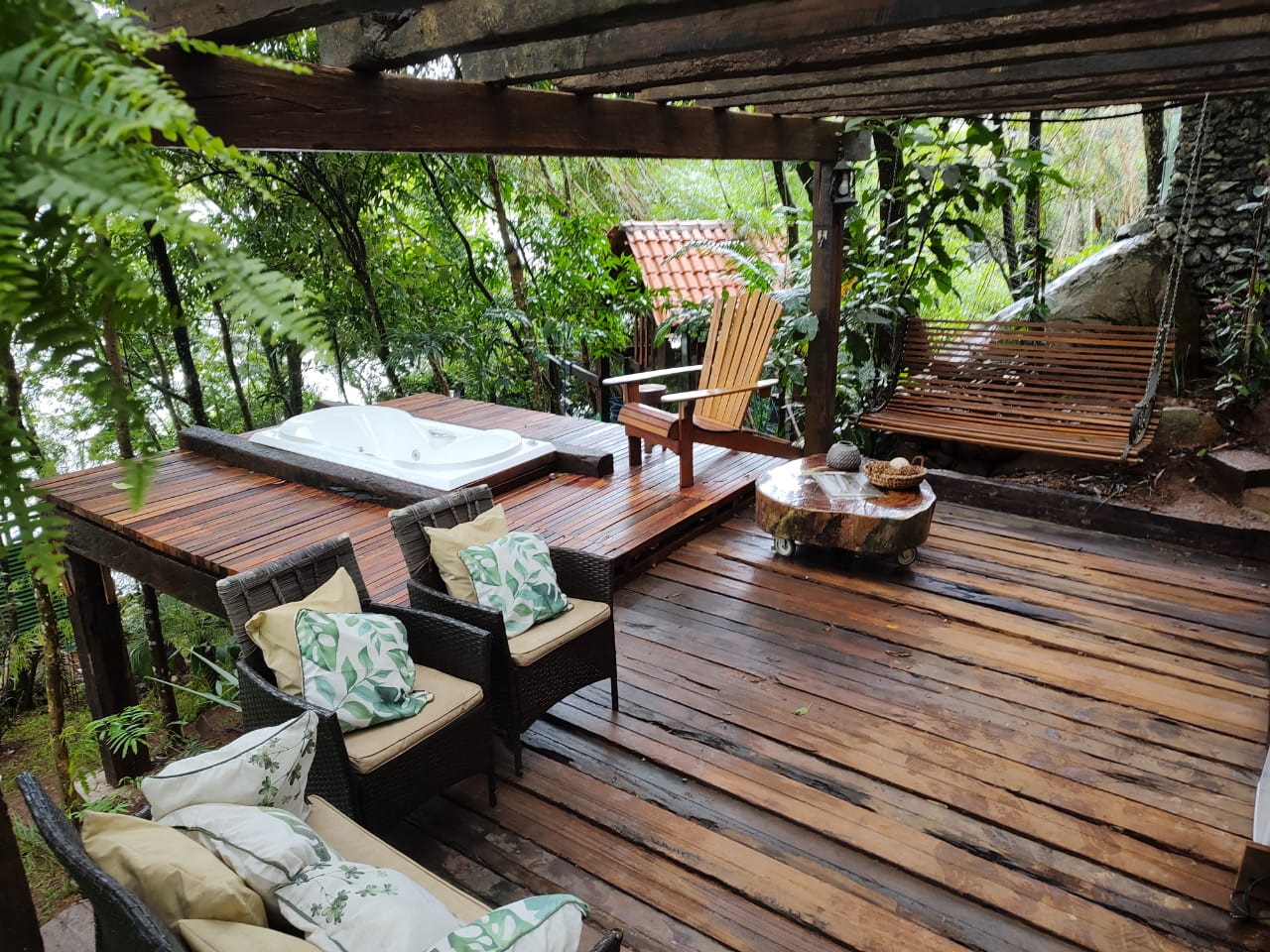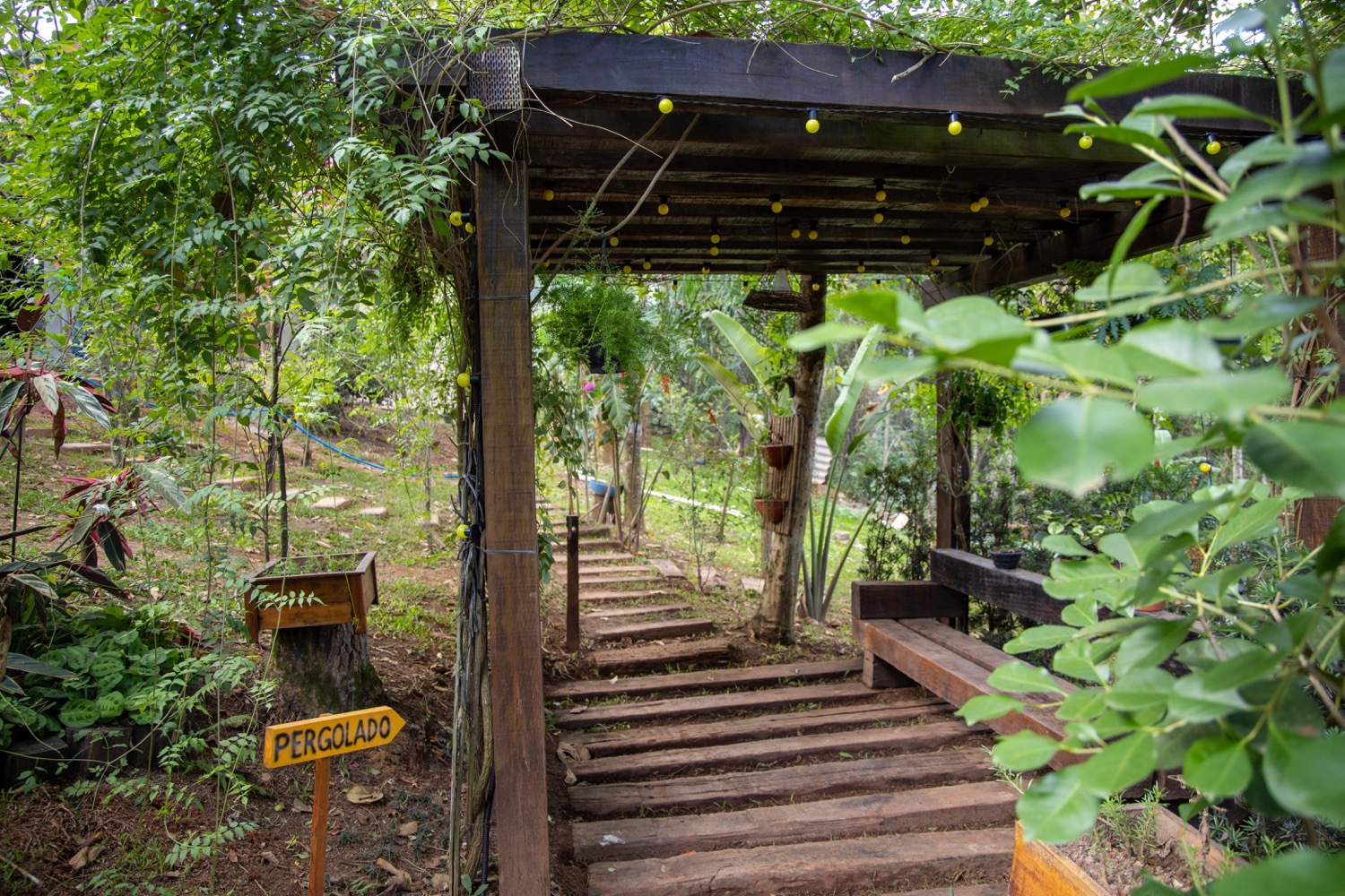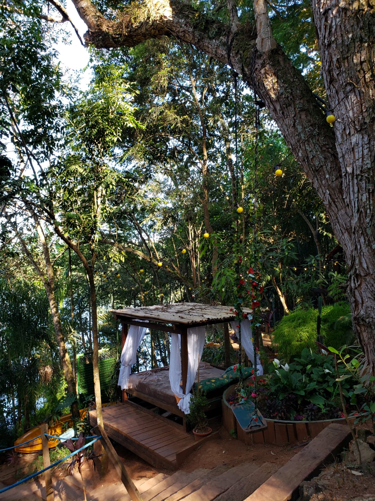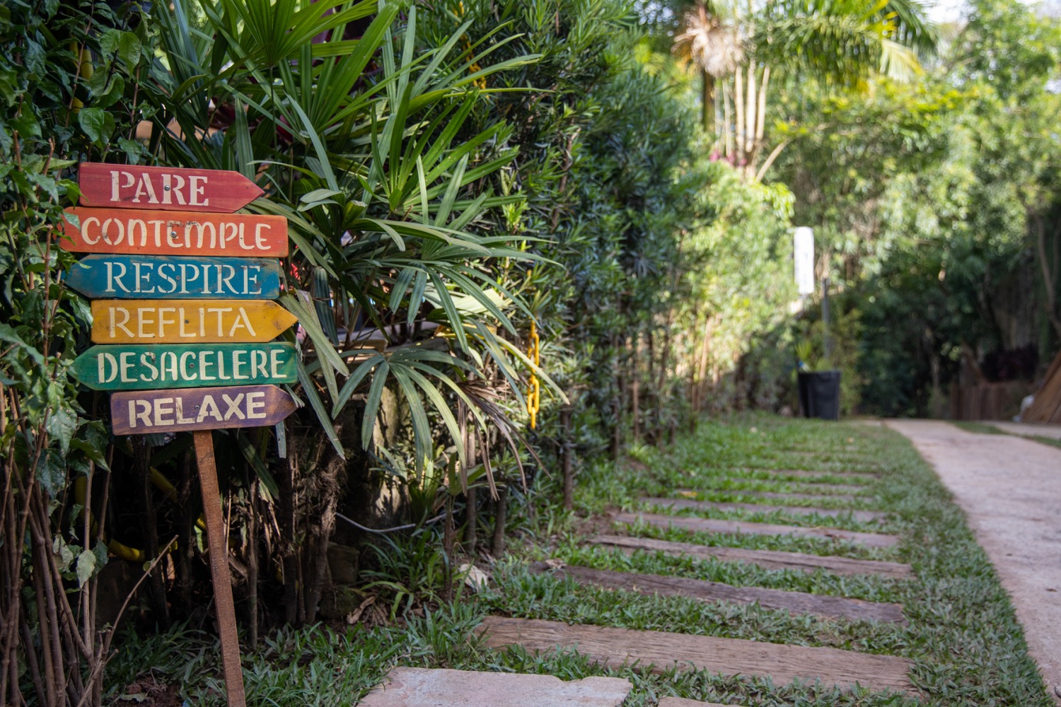 - Espaços para relaxar em meio à natureza: bancos, redes, bangalôs e balanços