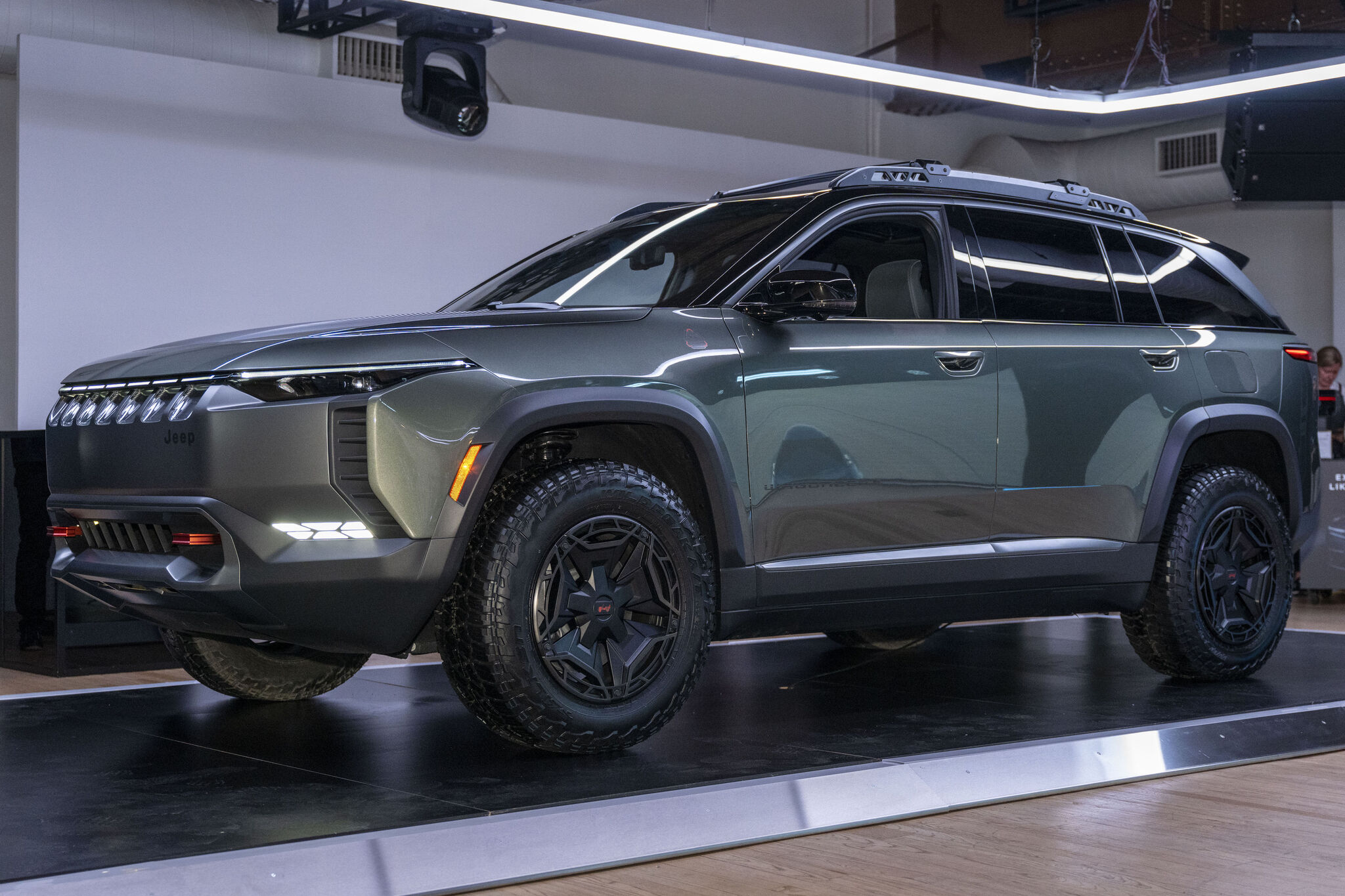 O conceito Jeep Wagoneer S Trailhawk é construído sobre a plataforma flexível STLA Large, uma base que permite uma versatilidade e adaptabilidade significativas. Esta plataforma é a pedra angular da linha totalmente elétrica Jeep Wagoneer S, que promete oferecer uma experiência emocionante tanto na estrada quanto fora dela. Então o veículo conceito é projetado para navegar em curvas fechadas com precisão e enfrentar terrenos off-road com facilidade, mostrando as capacidades dinâmicas do futuro elétrico da Jeep.