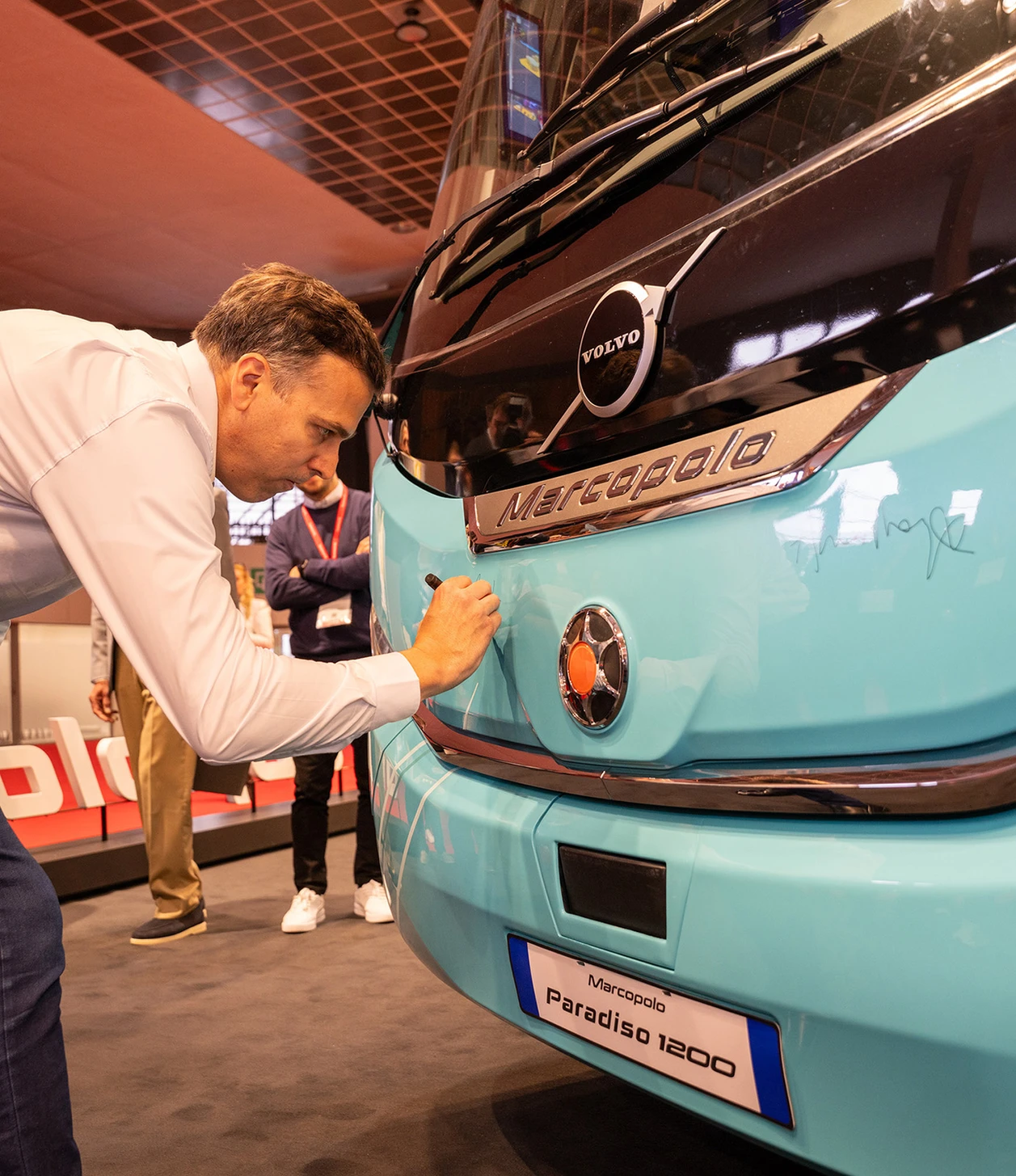 A cerimônia de assinatura do acordo ocorreu no estande da Marcopolo na Busworld, com a presença de Anna Westerberg, CEO da Volvo Buses; Thomas Nylund, diretor da Volvo Europe; André Armaganijan e João Paulo Ledur, diretor de Estratégia e Transformação Digital da Marcopolo. O protocolo foi simbolicamente firmado sobre o próprio veículo exposto — um Paradiso G8 1200 Volvo B13R.
