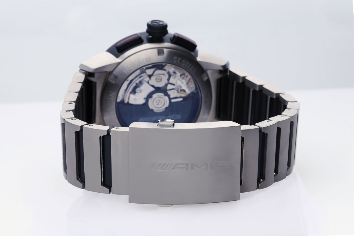 Feito para quem vive e respira desempenho, o AMG Business Automatic Chronograph alia esportividade e elegância clássica. Equipado com o calibre automático suíço SW500 da Sellita, o modelo apresenta o refinado acabamento Côtes de Genève e o padrão perlage, visíveis através do fundo em cristal de safira.
