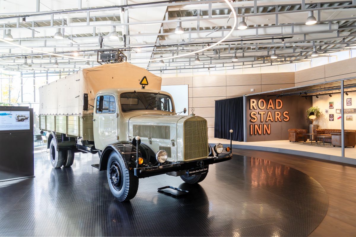 O History Wall, com 20 metros de extensão, conduz o visitante por uma linha do tempo que conecta o passado ao presente — do primeiro caminhão Daimler ao portfólio tecnológico atual.