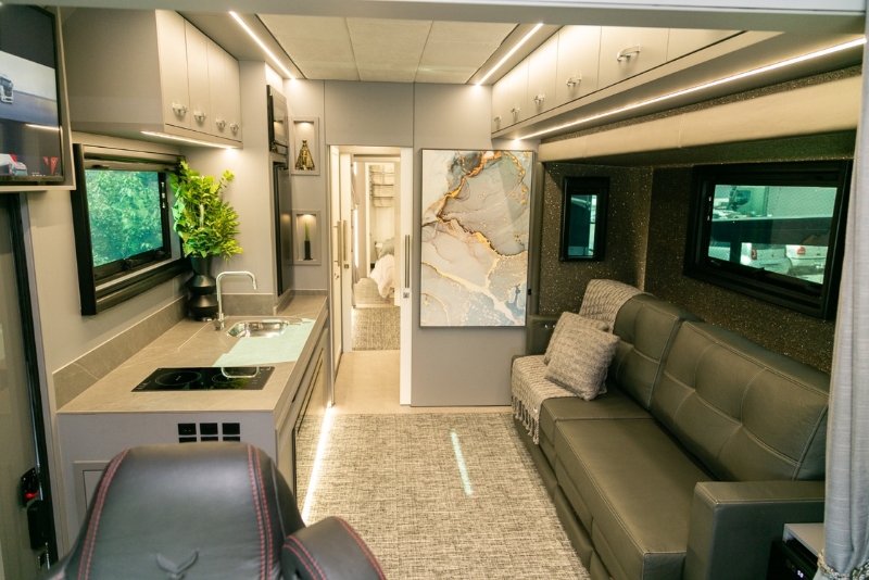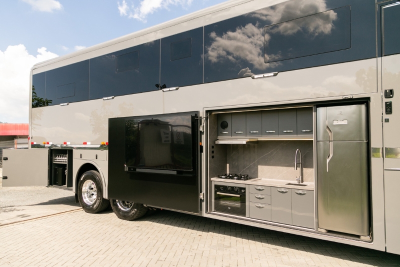Com 13,5 metros de comprimento e 45 m² de área útil com as laterais expandidas, o motorhome é uma verdadeira mansão móvel. Conta com dois quartos — um deles suíte —, banheiro, seis televisores (incluindo uma de 75 polegadas na cozinha externa), três aparelhos de ar-condicionado, forno elétrico, micro-ondas, adega, lareira, sistema de som JBL com sound bar e torre de 1.000 watts.