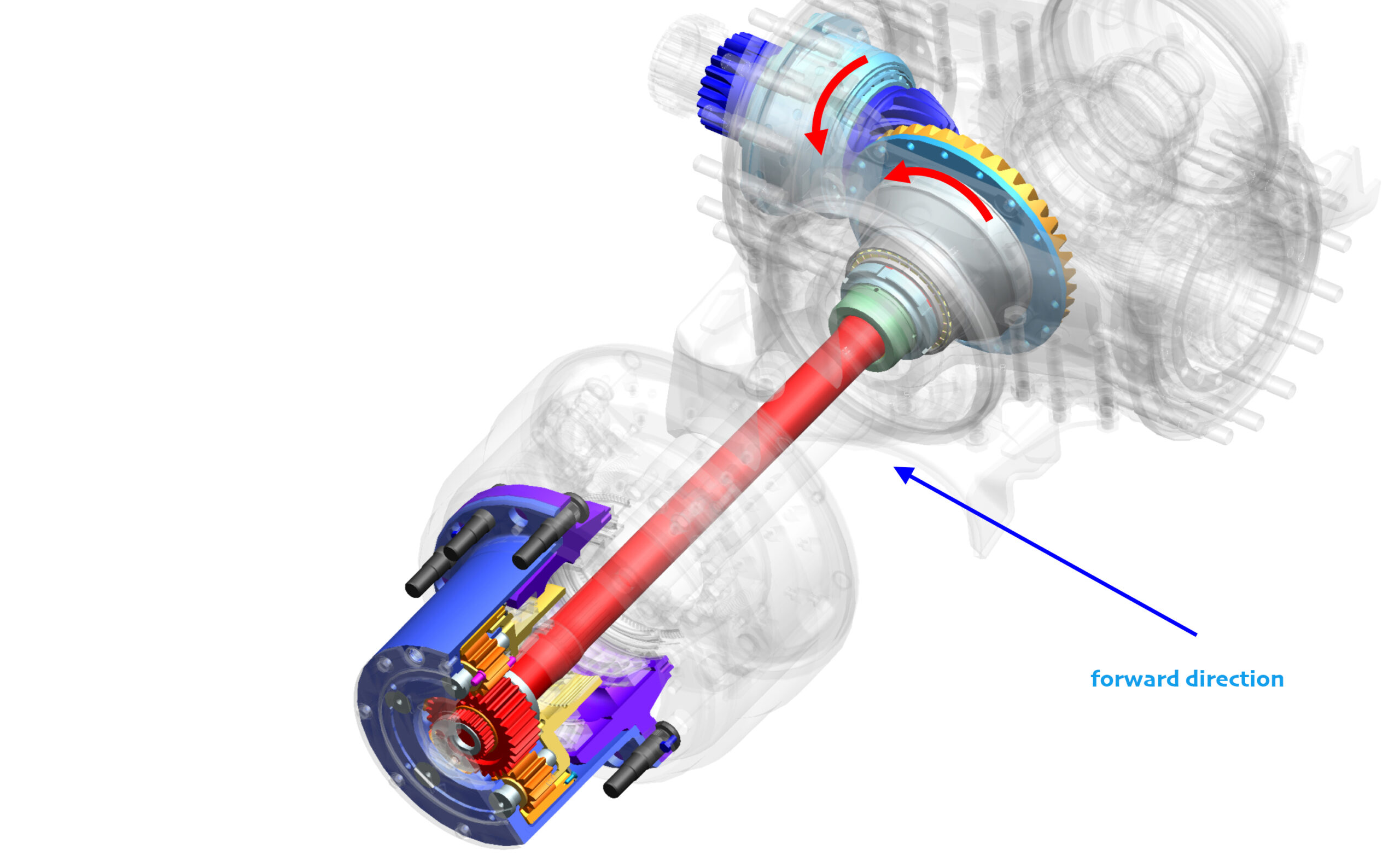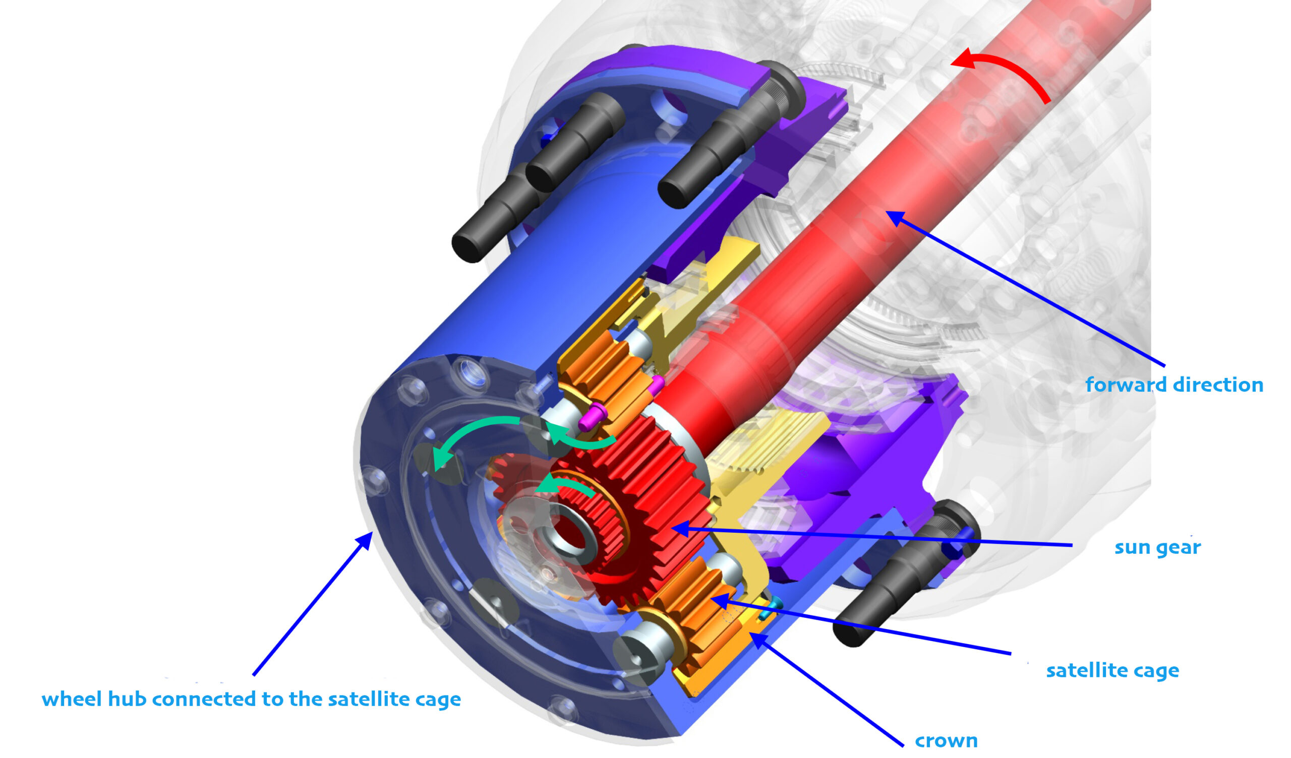 A nova solução de projeto com o chamado “planeta correto” significa que a engrenagem “solar” engata as engrenagens “satélites”, que não apenas giram em torno de seu próprio eixo, mas também giram juntamente com toda a gaiola. O resultado é, entre outras coisas, a unificação do deslocamento do semieixo esquerdo à frente do direito — o mesmo que nos eixos sem reduções. Isso leva a diversos benefícios construtivos.